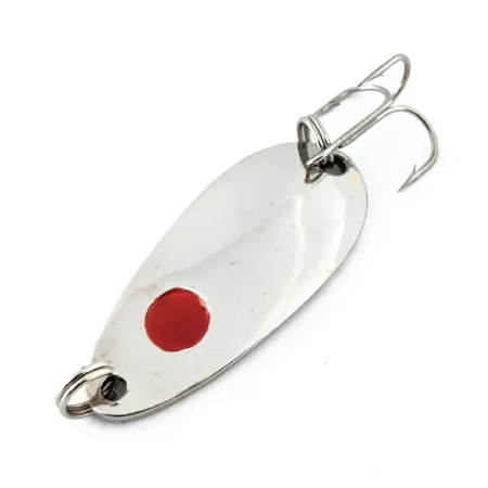 Featuring a classic nickel finish accented by a single, bold red strike point, this spoon represents a staple in Pacific Northwest angling history. The 1/4oz (7g) weight makes it a versatile choice for casting or trolling in various water conditions. Measuring 1 1/2" (4cm), the blade carries a distinct stamped marking on the reverse side: "Les Davis 1/4 OZ HOTROD," identifying its origins before Luhr Jensen integrated the brand into their lineup. This specimen, cataloged under product code 14911, is in exceptional condition, retaining its high-polish luster and sharp original hardware for a 5/5 rating. The American-made construction is evidenced by the clean metalwork and the secure attachment of the split rings and treble hook.