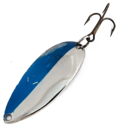 A striking blue finish covers half of the nickel-plated surface on this vintage Luhr Jensen spoon. Weighing in at 3/4oz (21g) with a length of 2 1/2" (6.5cm), the Lil' Kroc—often called the Krocodile Stubby—is a rarer find for collectors of Pacific Northwest tackle. The reverse side bears the crisp, deep stamps of the Krocodile and Stubby brand names, alongside the 3/4 oz weight marking. Cataloged under product code 15988, this USA-made specimen retains its bold color contrast and high-polish nickel shine. The hardware features a split ring connected to a treble hook that shows its age naturally. Rated at a 4/5 condition, it exhibits the honest character expected of a vintage tool while remaining a solid candidate for a species-specific display. Its wider body profile was a deliberate design choice by Luhr Jensen to differentiate it from the standard, slimmer Krocodile silhouettes used for casting and trolling in both fresh and saltwater environments.