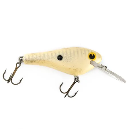 At 3/5 oz (16 g), this hand-crafted cedar crankbait carries the substantial feel that made Poe's a staple in tournament bass fishing. The Super Cedar RC-3, identified by product code 22032, features a 2 3/4" (7 cm) body turned from cedar wood, a material chosen for its density and buoyancy during casting. This particular specimen is finished in a classic cream shad pattern, accented by a prominent black lateral spot and yellow eyes with dark pupils. Secured to the front is a wide, clear plastic diving lip designed to drive the lure down during a steady retrieve. The hardware consists of two original belly and tail treble hooks, showing light signs of age that reflect its history. Made in the USA, the body retains a clean appearance, earning a 4/5 condition rating for some light field use.