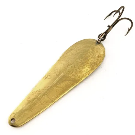 Tipping the scales at 2/5oz (11g), this brass spoon represents a classic piece of American angling history from Wright & McGill. Measuring 2 1/4" (6cm) in length, the teardrop profile is stamped on the underside with the manufacturer’s mark and the specific model name. The brass finish has been well-maintained, retaining a bright surface across its concave form. At the tail, a vintage treble hook is secured by a sturdy split ring, ready for the water or the display case. Cataloged under Product Code 11530, this specimen is in 4/5 condition, showing minor surface marks that indicate it has been part of a working tackle collection. This lure reflects the era when Wright & McGill transitioned their expertise from high-quality hooks into a broader range of successful metal hardware.