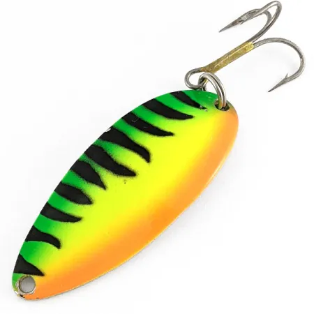 Stamped clearly on the polished nickel reverse of this 2 1/4" (5.5 cm) spoon is the iconic "Little Cleo" branding alongside the "WIGL" trademark. This 1980s specimen features a vivid Fire tiger pattern, characterized by a gradient moving from a deep green spine to a bright yellow belly and orange highlights, all overlaid with sharp black stripes. Weighing 2/5 oz (11 g), the lure's signature humped profile is a staple of Acme's USA-made production history. Cataloged under product code 21813, the hardware remains original, consisting of a treble hook reinforced with a brass-toned wrap and a stainless split ring. The paint finish and metal surfaces show no signs of use, warranting a condition rating of 5/5. Acme’s implementation of high-contrast colors during this era reflects the technical shift toward high-visibility lures for casting in varying water clarities. The line tie at the narrow end remains perfectly circular and free of tool marks.