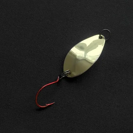 Weighing exactly 1/16oz (1.8g), this small-profile spoon showcases a high-polish gold finish that catches light from every angle. The reverse side features the classic "LITTLE CLEO" branding clearly stamped into the metal, a hallmark of Acme’s American production. At 1 1/4" (3cm) in length, the spoon is rigged with a vibrant red single hook, a detail often used to trigger strikes by simulating a target point. Both split rings are securely attached, showing no signs of fatigue or oxidation. This specimen is in 5/5 condition, retaining its original luster and smooth edges. The gold plating is uniform across the entire humped body, intended for slow-retrieval casting or light trolling in clear water. Product code 20329 represents a staple in many vintage tackle boxes for its simple yet effective metalwork.