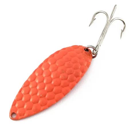 Orange paint covers a distinctive honeycomb texture on the convex side of this 3/4oz (21g) spoon, a feature that defines the 'bubbles' series from the standard smooth models. Identified by product code 21209, this Acme Little Cleo bubbles measures 2 1/2" (6.5cm) and showcases the classic wide-bodied profile that has made the brand a staple in American tackle boxes. While the front features the dimpled texture, the concave back is finished in a solid, smooth orange. The hardware consists of a sturdy, silver-tone treble hook attached by a split ring, designed for heavy casting applications. This specimen is in 5/5 condition, retaining a vibrant finish and bright metal components. A single attachment point is located at the narrow nose for a direct line tie or snap connection.