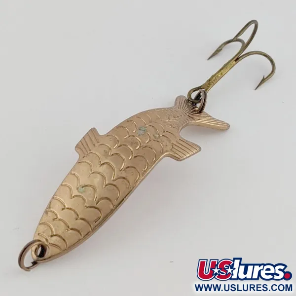 Stamped from solid brass with a deep copper finish, the curved profile of this 2" (5 cm) spoon creates a realistic three-dimensional silhouette in the water. Detailed scale patterns are etched across the body along with modeled fins near the tail to mimic a baitfish. Weighing 1/4 oz (7 g), the metal body is shaped with a subtle S-curve that maintains a consistent side-to-side swimming motion during a retrieve. The back of the spoon is clearly stamped with the manufacturer's mark, and the physical state of the lure is a solid 5/5. Primarily designed for casting, the hardware is secured through precisely punched holes at the head and tail, maintaining the intended balance of this vintage spoon, identified by product code 24453.