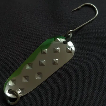 Diamond-shaped dimples stamped across the nickel-plated surface create a distinct reflective pattern on this 2 1/4" (5.5 cm) spoon. Luhr Jensen’s Alpena Diamond, cataloged under product code 22840, features a classic metallic finish accented by a vibrant green stripe along one edge. Weighing in at 1/4 oz (7 g), this USA-made specimen is designed for casting or light trolling, where the textured facets are intended to catch and scatter light. The spoon is rigged with a single hook attached via a robust split ring, keeping the profile streamlined. This specific rarity is in 5/5 condition, showing a high level of preservation for the polished metal and the painted accent. The transition between the nickel and the green paint is crisp, showcasing the craftsmanship typical of vintage Luhr Jensen production.