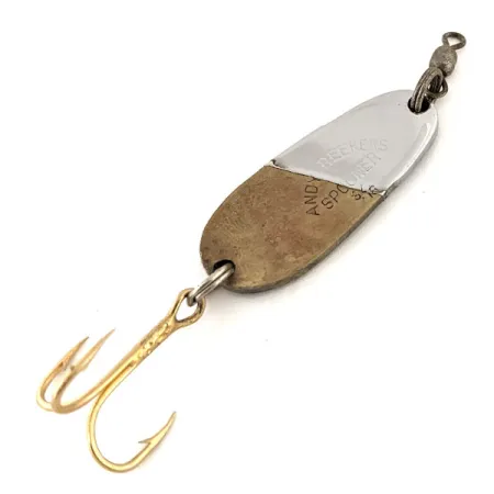 Two distinct metallic finishes meet at an angled seam on the body of this 1 1/2" (3.5cm) spoon. The nickel-plated top half provides high-flash reflectivity, while the bronze (brass) lower section offers a more subtle contrast that was a hallmark of Andy Reekers lures manufactured in the USA. Stamped clearly into the nickel side is the name Andy Reekers Spooner, showing the classic branding of this vintage piece. Weighing 1/4oz (7g), the lure is equipped with a gold-tone treble hook and a factory-attached barrel swivel to manage line twist during casting or trolling. The surfaces of this specimen, identified by product code 13183, are exceptionally well-preserved, earning a condition rating of 5/5. The original luster remains vibrant on both the silver and brass-colored segments of the metal body.
