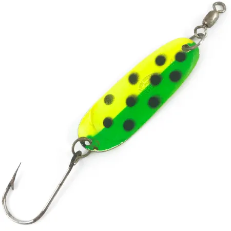 Measuring exactly 2 1/4" (6 cm) in length, this classic trolling spoon features a bold, high-contrast finish designed for maximum visibility. This Andy Reekers UV model, weighing 1/4 oz (7 g), showcases a distinctive front face split vertically between bright yellow and vibrant green, punctuated by a series of large black dots. The back of the lure is finished in a solid yellow UV-reactive coating, a technical choice intended for deep-water trolling where light penetration is limited. Rigged for immediate use, it includes a large single hook and a top-mounted barrel swivel connected by sturdy split rings. Manufactured in the USA under product code 4691, the nickel base provides a durable foundation for the paintwork. This specimen is in excellent 5/5 condition, showing a well-preserved surface typical of a high-quality vintage find. The paint remains vibrant across the stamped metal body, which is a hallmark of the Reekers design for salmon and trout anglers.
