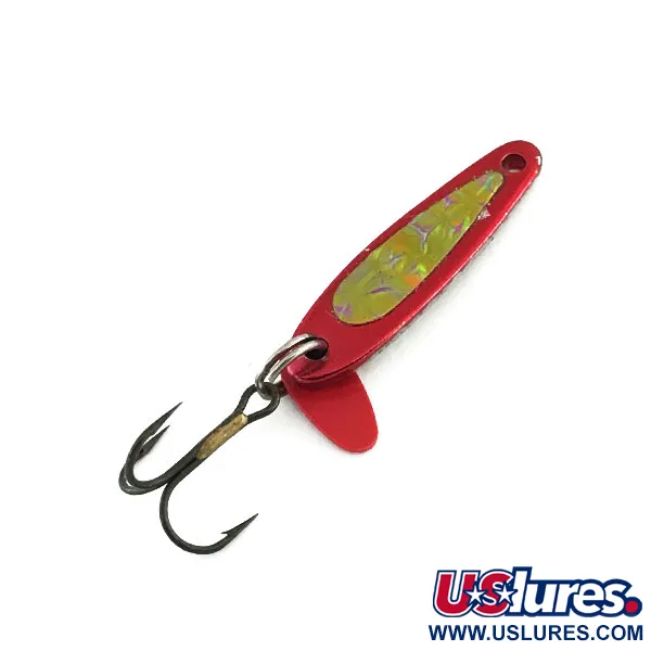Vibrant red enamel coats the front of this 1" (2.5 cm) vertical spoon, catching the light alongside a textured holographic prism sticker. Weighing in at 1/16 oz (2 g), this Bay de Noc Swedish Pimple, identified by product code 8936, features the signature flat profile that has made it a staple in Michigan-made tackle for generations. On the reverse side, the metal shows a clean, polished silver finish, providing a high-contrast flash. The hardware includes a sturdy split ring that holds both the sharp treble hook and a small, fluorescent red plastic flicker blade, designed to provide a distinct visual accent when worked vertically or cast. This particular specimen is in 5/5 condition, retaining its original luster and crisp edges on the painted surface and stickers. It reflects the simple yet effective design philosophy typical of the Gladstone, Michigan company's output.