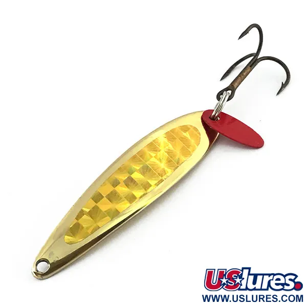 A substantial 1/2 oz (14 g) weight distributed over a 2 1/4" (5.5 cm) length allows this vertical jig to descend rapidly to the strike zone. This Bay de Noc Swedish Pimple, carrying product code 9053, sports a high-luster gold finish enhanced by a yellow holographic checkered tape that provides multi-directional flash. At the business end, a sturdy treble hook is mounted alongside a small red plastic flipper blade, which acts as a visual focal point against the gold body. Proudly made in the USA, this lure represents a design lineage favored by generations of ice and open-water anglers targeting deep-dwelling walleye and trout. The hardware and gold plating are in excellent form, earning this specimen a condition rating of 5/5. A clean line-tie hole sits at the tapered end, while the reverse side shows the smooth, reflective gold surface common to these Michigan-made classics.