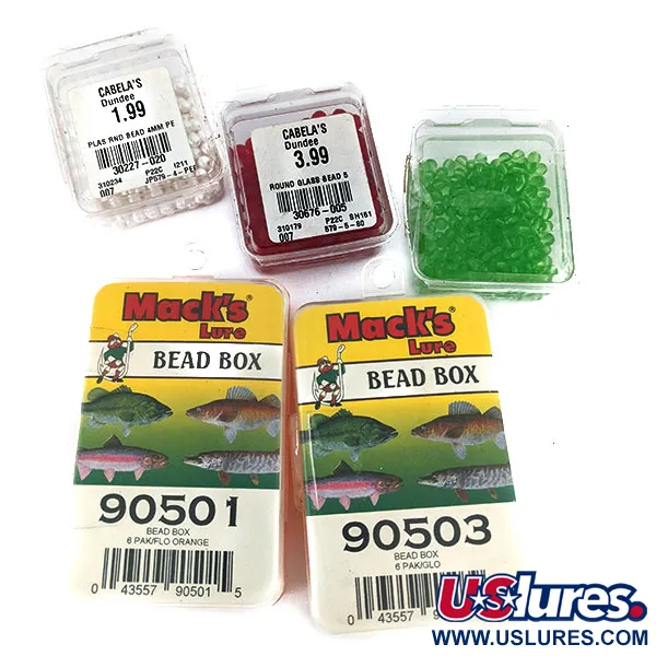 Multiple shades and materials characterize this vintage assortment of rigging beads, featuring pearl plastics, translucent green rounds, and vibrant red glass. These components, cataloged under product code 14057, include dedicated Mack's Lure "Bead Box" containers alongside original Cabela's packaging. The Mack's Lure 90501 box houses fluorescent orange beads, while the 90503 box contains a "pak/glo" variety. For more delicate presentations, the Cabela's 4mm (0.15 in) pearl and deep red glass options provide the necessary flash and weight for building inline spinners or crawler harnesses. This entire collection is unused, preserved in its original clear-top containers with vintage price tags still intact. These beads remain a staple for anglers who hand-tie rigs or modify feeder setups for specific water clarity.