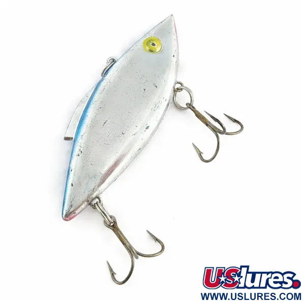 A reflective chrome finish dominates the sides of this 3" (7.5 cm) lipless crankbait, providing high visibility for deep-water coverage. This Bill Lewis Rat-L-Trap, sporting the RT 25 Chrome Blue Back color pattern, features a deep blue spine and a subtle red accent beneath the nose. At 1/2 oz (14 g), its weight is distributed to facilitate long-distance casting and a fast sink rate. The lure is equipped with its original dual treble hooks and a top-mounted line tie secured by a split ring. Yellow eyes with dark pupils give it a lifelike appearance. Cataloged as product code 24444, this USA-made specimen is in 4/5 condition, showing the durability of its original plating. The internal rattle chamber is specifically designed to emit sound through the water, a technical hallmark of the brand's construction since its inception.