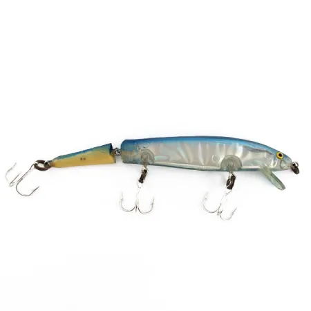 Tipping the scales at a balanced 1/3 oz (9 g), this American-made rarity showcases the classic design aesthetics of Norman's heritage. The Clear/blue finish features a translucent body that reveals the internal structure, paired with a subtle blue back that transitions into a yellowish-cream tail section. This Bill Norman Deep 2J, identified by product code 21402, is a jointed floating minnow measuring 4 1/4" (11 cm) in total length. The two-piece construction is connected by a sturdy metal hinge, intended for versatile casting or trolling applications. It comes equipped with three sets of treble hooks, and the specimen maintains a 5/5 condition with clear, vibrant coloring and intact hardware. Designed to operate in the 1 ft (0.3 m) to 4 ft (1.2 m) depth range, the lure features a clear diving lip and a distinct yellow eye on the lead segment.