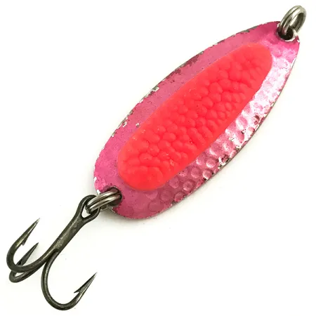 Hammered pink finishes across this 1/2 oz (14 g) brass body create a distinct visual profile, characteristic of the Blue Fox Pixee series. Measuring 2 1/4" (5.5 cm) in length, this lure is defined by its integrated simulated salmon egg insert, a textured fluorescent feature that has helped anglers target salmon and steelhead for decades. The heavy-gauge construction of the product code 5696 allows it to settle into deeper pockets of river water or maintain stability when trolled. Stamped clearly on the back with the Blue Fox logo, the metal shows a well-preserved surface with only minor evidence of its history in the tackle box, earning a condition rating of 4/5. Its original treble hook remains sharp and properly seated on the split ring, providing a reliable connection for casting into coastal winds or working through freshwater pools. This specimen represents the evolution of the original National Expert Bait designs, maintaining the classic proportions that made the Pixee a staple in many vintage collections.