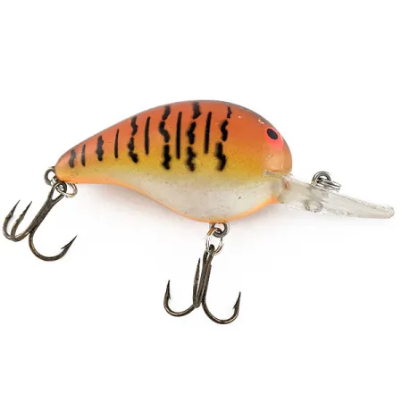 The bold black vertical stripes against a warm orange and yellow gradient give this Bomber Fat A B05F a classic look that remains a staple in many tackle boxes. Measuring 2" (5cm) and weighing 1/3oz (10g), this compact crankbait is engineered to reach depths of 6-8ft (1.8-2.4 m) during a retrieve. The rounded body profile, typical of the Fat A lineup, is paired with a clear diving lip and vibrant red eyes positioned on the upper portion of the head. Its lower section transitions into a pale, creamy white, providing a subtle contrast from beneath. This specimen, identified by product code 17238, is in 5/5 condition, showing off a beautifully preserved finish and original treble hooks. Anglers often turn to this floating model for casting techniques when specifically targeting species like perch or chub.