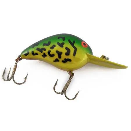 Tipping the scales at 3/5oz (17g), this Bomber Fat A B06F features a distinctive G Finish reflective green pattern that catches light across its broad profile. Measuring 2 1/4" (6cm) in length, this floating crankbait is built for depth, reaching between 2.4-3 m (8-10 ft) thanks to its prominent diving lip. The color scheme is a vibrant gradient, transitioning from a metallic gold underbelly to a deep green spine, overlaid with bold black leopard-style spotting. Originating from the USA, this specimen carries product code 18324 and maintains a pristine appearance with a condition rating of 5/5. Two original treble hooks are present, and the red-orange eyes add a classic focal point to the head. Anglers often turn to this specific model when casting for perch or chub in deeper structures.
