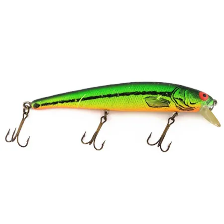 Weighing 2/5 oz (12 g), this USA-made minnow lure showcases a striking XFTB color scheme characterized by a bright green top, gold scale-patterned sides, and a warm orange underbelly. The body of this Bomber Long A, registered under product code 19492, spans 4 3/4" (12 cm) and features a rattling internal chamber designed to grab the attention of pike and zander. Designed to suspend in the water column, it utilizes a clear plastic diving lip to achieve depths between 2-3 ft (0.6 - 0.9 m) when casting, while reaching 4-8 ft (1.2 - 2.4 m) during trolling sessions. A prominent red eye and detailed black gill etchings complement the dark lateral line that runs the length of the lure. Held in 4/5 condition, the finish retains its original luster and the three treble hooks are securely attached to their respective hangers.