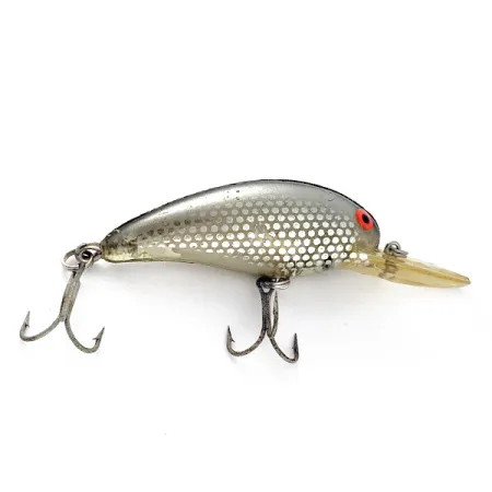 Silver scale patterns across a translucent body define the look of this 2 3/4" (7 cm) vintage specimen. Identified by product code 21550, this Bomber Model 7A weighs 1/2 oz (14 g) and is engineered for an operating depth of 8 - 10 ft (2.4 - 3.0 m). The lure's internal rattling mechanism provides an audible signature beneath the surface, a hallmark of the Model A series' design. Made in the USA, the body features a striking red eye and original hardware that remains in solid 4/5 condition. Both walleye and pike anglers will recognize the utility of this floating lure, which remains a reliable choice for navigating mid-depth contours. The hardware shows slight evidence of past use but maintains its structural integrity, reflecting the long-standing durability Bomber is known for in the tackle world.