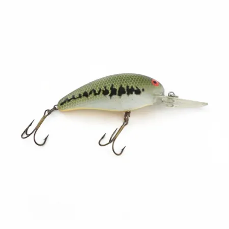 Adorned with a classic bass pattern, this specimen represents the legendary Model A lineage known for reliable deep-diving performance. Weighing in at 1/2oz (14g) and measuring 2 3/4" (7cm), it is a substantial choice for reaching those deeper targets between 8ft (2.4 m) and 10ft (3.0 m). The long, clear plastic lip is designed to pull the lure down quickly whether you are casting or trolling for walleye and pike. The body features an internal rattle, providing a noisy profile that is a staple of the American-made Bomber series. Looking at the hardware, the treble hooks show minimal wear, and the paint finish remains vibrant with only light signs of previous use. This particular Bomber Model 7A, identified by product code 23821, rates at a solid 4/5, showing the care taken by its previous owner. Bomber's transition into plastic molded baits like this one revolutionized how deep-water structures were fished in the USA. The red eye detail provides a sharp focal point against the green and black lateral markings.