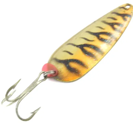 At 2/3 oz (19 g) in weight, the Boss Spoon by Boss Lures showcases a Golden Tiger finish designed to fluoresce under UV light for increased visibility in stained water. This USA-made specimen, listed under product code 4070, measures 2 3/4" (7 cm) and utilizes a teardrop profile optimized for casting and trolling. A sturdy treble hook is secured with a split ring alongside a pink attractor tab, adding a small splash of contrast to the gold and black tiger-stripe pattern. The reverse side of the metal body is unpainted brass, providing a distinct flash during its movement through the water column. Rated in 4/5 condition, the lure appears well-maintained with only minor surface marks consistent with its age. This particular coloration is specifically intended for low-light conditions or deeper water where the UV-reactive paint provides a visual advantage.