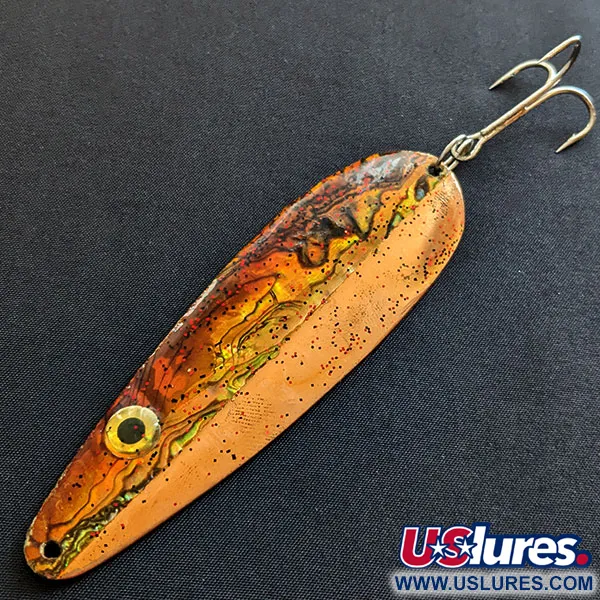 Polished copper serves as the foundation for this 1oz (28g) heavy-duty spoon, showcasing a deep "CORMORAN" stamp impressed into the metal on the reverse side. Measuring 4 1/4" (10.5cm) in length, this Cabela's specimen carries product code 19348 and represents a classic USA-made design. The face of the spoon features a sophisticated, organic color palette with ripples of deep orange, gold, and burnt umber that mimic natural iridescence, further accented by a fine dusting of black glitter across the copper surface. A prominent eye with a gold iris and black pupil is positioned near the nose to provide a distinct target for predators. Rated 5/5, the lure is in excellent condition, with the bright copper finish and intricate painted patterns remaining vibrant. The hardware includes a sturdy split ring and a classic treble hook, both reflecting the high-quality construction intended for casting or trolling.