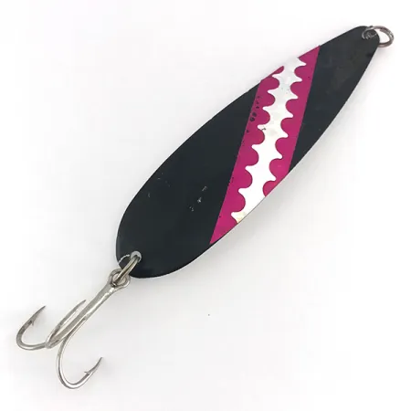Stamped with a distinctive skull and crossbones emblem alongside the '66' designation, this trolling spoon represents a classic piece of American tackle craftsmanship. Measuring 4 3/4" (12 cm) in length, the lure features a striking black finish contrasted by a bold diagonal band of pinkish-purple and a white serrated "sawtooth" pattern. This specific Calcutta model, cataloged under product code 7696, carries a weight of 2/3 oz (18 g), making it substantial enough for its intended trolling applications. The metallic finish on the patterned section displays a subtle holographic shimmer, designed to reflect light while moving through the water. The hardware consists of a sturdy treble hook attached via a split ring, showing the build quality expected of a USA-made lure. Rated at a condition of 5/5, the surface finish remains vibrant and well-preserved.