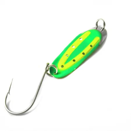 Finished in a vibrant neon green and yellow pattern, this specimen from Lake Products represents a classic era of American trolling tackle. Weighing 1/4oz (7g) and measuring 2 1/4" (6cm) in length, the lure features a distinct paint scheme with dark spotting along the edges of its curved metal body. The hardware includes a robust single hook and split rings at both ends, designed to withstand the demands of steady trolling. This particular Charger, identified by product code 0443, remains in great shape with a condition rating of 4/5. Produced in the USA, the construction utilizes a slim profile that interacts with water pressure during a constant retrieve to maintain its position in the water column.