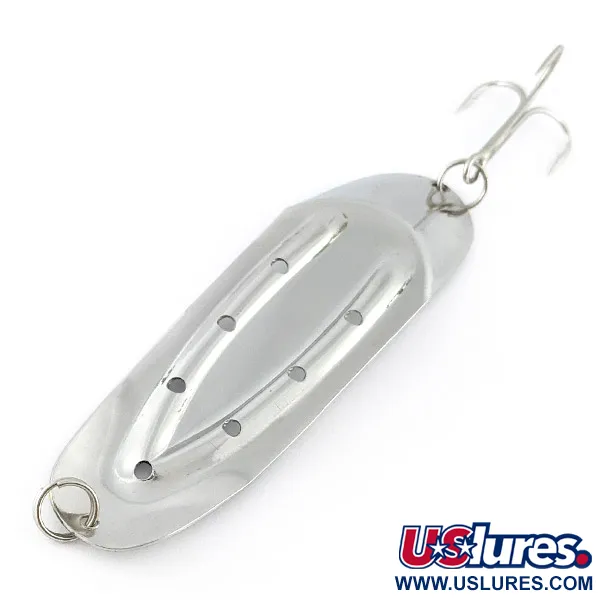 Polished nickel plating provides a mirror-like finish across the 4 1/4" (11 cm) frame of this Lake Products spoon. Weighing 3/4 oz (21 g), the Charger №4 is a substantial piece of vintage American tackle with a distinctive architectural build. A deep central groove runs along the length of the body, containing eight small circular holes designed to allow water passage through the metal. The name "CHARGER" and size "№4" are crisply stamped into the metal near the tail hook attachment point. This particular specimen, cataloged as product code 23218, showcases the high manufacturing standards of its USA origin and is preserved in 5/5 condition. The hardware consists of a classic treble hook connected via a robust split ring, accompanied by a matching split ring at the head for easy line connection.