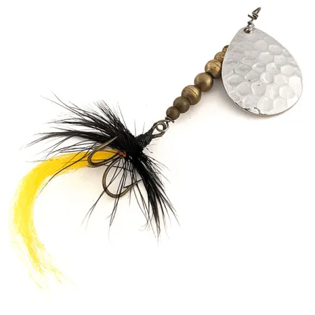 Graduated brass beads form the core of this French-made lure, providing a balanced 1/4oz (7g) weight for casting. This C.P. Spoon, listed under product code 12638, showcases a classic hammered nickel blade that contrasts with the warm tones of the brass body components. Measuring 3 1/4" (8cm) from the top eyelet to the hook, the assembly features a carefully wrapped black feather hackle and a bright yellow yarn tail on the treble. The hardware, including the wire shaft and clevis, appears sturdy and well-aligned, reflecting its 5/5 condition rating. C.P. Swing lures from France are known for this specific teardrop blade shape and textured finish, which is seen here with a clean, unblemished surface. The feathered hook remains dense, and the wire wraps at the head and tail are tight and secure.