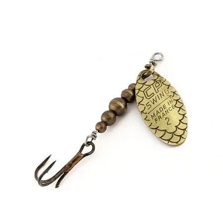 Stamped clearly on the brass blade, the number "2" signifies the size of this classic French spinner from C.P. Swing. At 3/32 oz (2.7 g) and measuring 2" (5 cm) in length, it represents a standard for light-tackle trout and panfish angling. The solid brass construction extends from the scale-etched oval blade through the graduated metal beads that form the body weight. Labeled with product code 12622, this specimen is rated 4/5; while the spinner assembly itself is well-preserved, one point on the treble hook has been previously clipped. The "MADE IN FRANCE" engraving remains sharp, a testament to the manufacturing quality of these mid-century European lures.