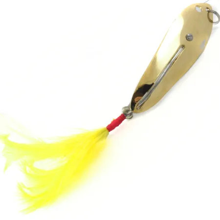 A high-polished Gold finish covers the stamped body of this Crippled Alewive Lure, cataloged under product code 4137. Tipping the scales at 1 1/4 oz (35g), the spoon utilizes a distinct weedless design including a protective wire to shield the main hook point from heavy vegetation. The 4" (10cm) frame is notable for its offset geometry and an unusual secondary hook arrangement tucked beneath the yellow feather dressing. These vibrant yellow feathers are securely lashed to the tail with bright red thread, providing a significant profile contrast against the metallic gold surface. The metal hardware, including the screw-fastened hook assembly and top split ring, appears bright and well-maintained, showing no signs of previous use. This specific construction by the Crippled Alewive Lure company focuses on durability for casting into thick cover.