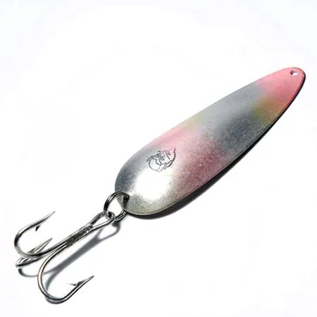 A shimmering Rainbow Silver gradient distinguishes this 3 1/2" (9cm) Eppinger spoon, a profile specifically designed for heavy casting applications. Identified by product code 0242, the specimen features the iconic stamped devil logo on its front face. On the reverse, the "DARDEVLE DETROIT USA" and "1 OZ" stamps are clearly legible, marking its origin from the manufacturer's early Michigan production. Weighing 1oz (28g), the lure uses a heavy-gauge metal that provides the density needed for reaching depth or cutting through wind. The hardware is in excellent shape, featuring a bright treble hook and a strong split ring. Given its 5/5 condition rating, the paint remains smooth across the concave surface with no signs of use. This oblong shape is engineered to generate a unique wobbling action, a technical feature that has defined the brand since Lou Eppinger founded it in 1906. The durable construction is a hallmark of the series, which famously saw these lures included in aviation survival kits during wartime.