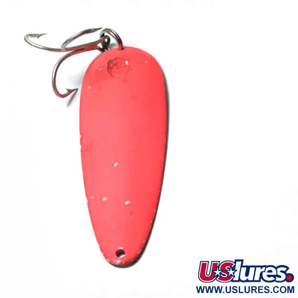 Scaling in at 1 oz (28 g), the lure presents a substantial profile for both collectors and active anglers. Measuring 3 1/2" (9 cm), the convex side is finished in a Dark Red / Pink hue and features distinctive white flecks alongside the pressed imp logo. Turning the spoon over reveals a silver concave surface clearly stamped 'DARDEVLE DETROIT USA,' a nod to the Eppinger legacy in Michigan. This specimen, assigned product code 0244, comes equipped with a sturdy treble hook and split ring. The condition is rated 4/5, exhibiting soft signs of age such as minor paint loss near the line-tie hole and edges. The metal surface on the interior remains clean and reflects light well.