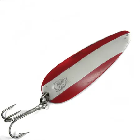 Red and white stripes cover the convex face of this heavy 1oz (28g) casting spoon, a visual pattern that has become synonymous with American angling history. This specific specimen, cataloged under product code 0336, measures 3 1/2" (9cm) and displays the clear, crisp stamp of "DARDEVLE DETROIT, U.S.A." on its metallic reverse. The condition is a solid 4/5, showing minor signs of its age while maintaining the integrity of the original paint and the iconic devil head logo near the hook eye. Eppinger's proprietary dies give the metal its distinct oblong, concave shape, which provides a consistent wobbling motion when drawn through the water. Originally hand-made by Lou Eppinger in his Detroit basement starting in 1906, these lures eventually became so trusted they were even packed into military survival kits during wartime. A sturdy treble hook is secured to the tail, paired with a classic attachment hole at the nose for your leader or snap.