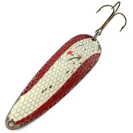 Tipping the scales at a substantial 1 oz (28 g), this vintage specimen features a classic textured scale finish in red and white. Measuring 3 1/2" (9 cm) in length, the spoon carries the distinctive "DARDEVLE DETROIT U.S.A." stamp on its reverse, a detail that dates its manufacture to the era before Lou Eppinger moved operations to Dearborn in 1959. This specific item, identified by product code 19164, showcases a honeycomb-like scale pattern on the convex side, offering a tactile variation to the more common smooth paint finishes. The nickel-colored back remains bright, while the painted face shows minor surface wear and small chips from previous outings, giving it a well-earned 4/5 condition rating. It comes equipped with a large, bronzed treble hook secured by a robust split ring, designed for targeting heavy-hitting pike or muskies. The forward line tie is clean and open, ready for a wire leader or snap swivel.