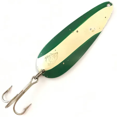Weighing in at 1oz (28g), this classic spoon shows the iconic color scheme often sought by pike and musky hunters. Measuring 3 1/2" (9cm) in length, the spoon features a Nickel / Green / White finish, characterized by its deep green paint and a diagonal cream-colored stripe. The small, distinctive Eppinger devil head logo is stamped directly onto the painted surface near the base. Flip the lure over to find the authentic "DARDEVLE DETROIT, U.S.A." stamp clearly visible on the polished nickel backside. Equipped with its original treble hook, this specimen carries the product code 4201. In terms of condition, it sits at a 4/5, showing light surface wear and minor paint chips that speak to its vintage character while maintaining a bright finish. The heavy gauge metal construction and concave shape are designed for effective casting and trolling in various water depths. Historical records show that Lou Eppinger's designs, like this Detroit-stamped piece, were even utilized in military survival gear due to their reliability.