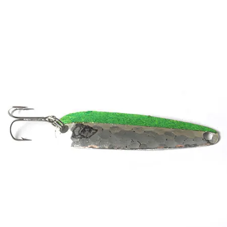 A hammered metal texture covers the lower half of this 3/16oz (5g) spoon, providing a multi-faceted reflective surface that contrasts against the upper portion's vibrant green glitter finish. This specific Dardevle Chuck-lett, cataloged under product code 0167, represents a classic size in the Eppinger lineup, measuring 2 1/2" (6.5cm). The nickel-and-green color scheme is a tactical choice for clear water conditions where the bright flash mimics the scales of small forage. A small, stamped devil-head logo—a hallmark of the Eppinger company since its early days in Detroit—is visible near the split ring. This specimen is designed for trolling, featuring an oblong body that interacts with water pressure to create a distinct movement. Regarding its condition, the lure is rated a 4/5, displaying light signs of handling while maintaining a sharp, original treble hook and vivid coloration.
