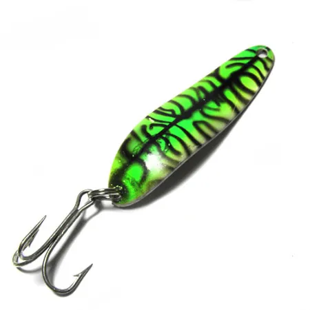 Bold neon green highlights contrast against a dark, segmented pattern on this 1/3 oz (10 g) casting spoon. Measuring 2 1/4" (5.5 cm), this Dardevle Cop-E-Cat 7300 carries the distinct oblong shape and concave stamped surface that made Eppinger a household name in American tackle boxes. Cataloged under product code 0411, this specific color scheme utilizes high-contrast markings to maintain visibility in various water clarity levels. Eppinger has been crafting these in the USA since 1906, eventually moving operations to Dearborn, Michigan, in 1959 where their proprietary dies continue to produce this classic silhouette. The condition sits at a respectable 4/5, with the vibrant finish and metal hardware showing very light signs of handling. A silver-tone treble hook is securely attached via a heavy-duty split ring at the base. The spoon's geometry facilitates a steady wobbling movement upon a slow retrieve, a hallmark of the manufacturer's century-long engineering history.
