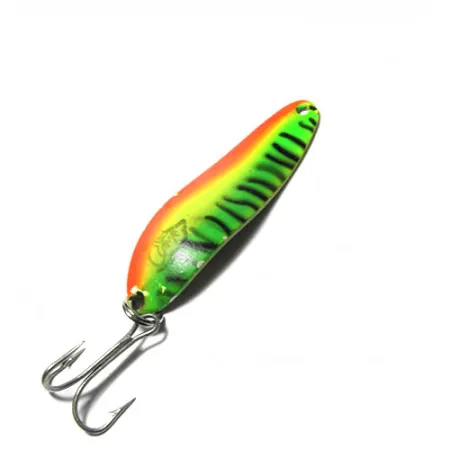 Weighing 1/3 oz (10 g), this Eppinger creation provides the necessary mass for long casts even against a light breeze. This Dardevle Cop-E-Cat 7300, identified by product code 0415, features a high-visibility Fire Tiger pattern over a solid brass body. Measuring 2 1/4" (5.5 cm), the spoon displays the classic oblong shape that has made Lou Eppinger’s designs a tackle box staple since the early 1900s in Detroit. The finish is in 4/5 condition, showing well-preserved color and distinct black vertical bars that contrast sharply against the orange, yellow, and green gradient. On the lower portion of the convex side, the distinctive brand stamping is visible near the split ring. The hardware includes a sturdy treble hook attached via a robust split ring. Because it is built on a brass base, it offers a different light reflection compared to nickel-backed versions, often preferred in clear water scenarios where a subtle flash is desired. The manufacturing heritage of these lures remains centered in Michigan, continuing the tradition of using proprietary dies to maintain the specific curvature of the metal.