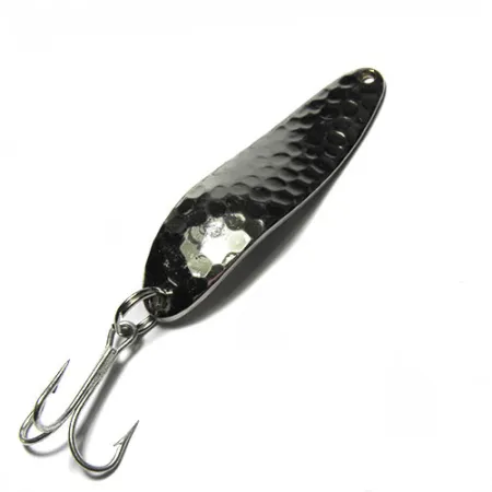 Hammered nickel surfaces define the face of this 1/3oz (10g) vintage spoon, a texture specifically designed by Eppinger to catch and throw light in multiple directions. Measuring 2 1/4" (5.5cm) in length, this Dardevle Cop-E-Cat 7300 carries the distinctive "DETROIT U.S.A." stamp on its concave back, a clear link to the company's early production roots before their move to Dearborn in 1959. As an authentic piece listed under product code 0418, the specimen features a polished concave interior that contrasts beautifully with the dimpled exterior. This specific lure maintains a 5/5 condition rating, appearing remarkably well-preserved with sharp treble hook hardware and a secure split ring attachment. Lou Eppinger’s commitment to quality is evident in the heavy-duty stamping and the proprietary die-cut shape that allowed these lures to be trusted even in wartime aviation survival kits. The weight distribution is centered to aid in long-distance casting from shore or boat, while the silver-toned nickel finish provides maximum visibility in various water clarities.