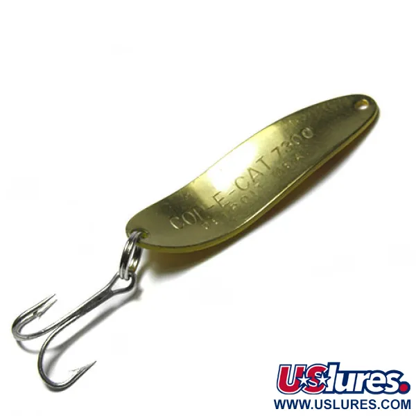 Five iconic red diamonds contrast sharply against the bright yellow finish of this vintage Eppinger classic. Measuring 2 1/4" (5.5 cm) and weighing in at 1/3 oz (10 g), this Cop-E-Cat 7300 is a versatile size for various freshwater species. Carrying the product code 0419, this specimen features the trademark stamped devil head logo clearly visible on the yellow painted surface. The Eppinger brand originated in Detroit, Michigan, and this spoon showcases the proprietary die-shaping that defines the brand's American-made heritage. It comes rigged with a strong split ring and a sharp treble hook, suitable for both casting and trolling applications. The overall finish is quite well-preserved, leading to a condition rating of 4/5. When pulled through the water at a steady speed, the oblong shape and concave face work together to create a distinct visual profile.