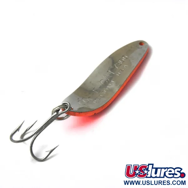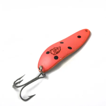 Six distinct black dots are stamped onto the vibrant orange finish of this classic American-made spoon. Weighing in at 1/2 oz (14 g) and measuring 2 1/4" (5.5 cm), this Eppinger Dardevle Cop-E-Cat 7300 carries the iconic Devil Head logo that has identified these Michigan-born lures for over a century. The reddish-orange paint provides a high-contrast profile, while the stamped metal body is designed for versatile casting and trolling applications. Identified by product code 0449, the hardware consists of a robust treble hook and a reliable split ring assembly. This particular specimen is in 4/5 condition, showcasing the durability of Lou Eppinger’s original manufacturing standards. The concave interior surface provides the necessary water displacement for its signature movement through the water column.