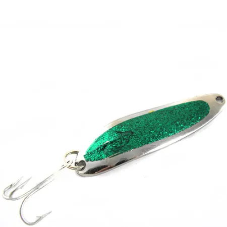 Stamped with 'COP-E-CAT 7300 DETROIT U.S.A.' on its concave interior, this Eppinger Dardevle specimen highlights the craftsmanship of its Michigan-based origins. The spoon measures 2 1/4" (5.5 cm) and weighs 1/3 oz (10 g), offering a balanced profile for casting or trolling. Its visual identity is defined by a Nickel / Green finish, where a vibrant green glitter inlay is framed by a polished nickel border.