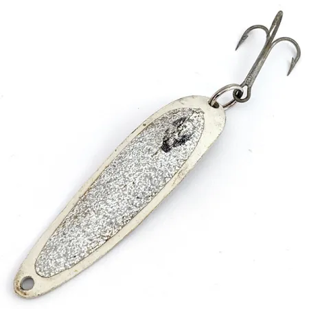 A heavy silver textured coating covers the front of this Nickel / White lure, creating a multifaceted reflective surface designed for high visibility underwater. This Eppinger Dardevle Cop-E-Cat 7400, cataloged under product code 15919, features the historic Detroit, U.S.A. stamp on its reverse nickel-plated side. Since the manufacturer relocated to Dearborn in 1959, this specific marking identifies the piece as an earlier production from the brand's original Michigan workshop. The spoon measures 2 1/2" (6.5 cm) and remains in unused condition, appearing as clean as the day it was produced. Its hardware includes a sturdy treble hook attached via a split ring, showing no signs of age. The stamped lettering for the model name is crisp and deeply struck into the metal, maintaining the specimen’s original identity.