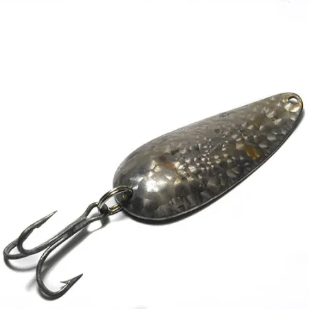 A hammered, scale-pattern silver finish catches the light on this 3" (7.5 cm) Eppinger spoon, a design that has been produced with proprietary dies since the company’s early days in Michigan. This specimen, carrying product code 0305, is finished in the Crystal (Scale Silver) colorway, providing a multifaceted reflection on the water compared to standard smooth spoons. The classic Dardevlet name is clearly stamped into the concave belly of the lure, marking its authenticity and American heritage. In 4/5 condition, the metal surfaces remain bright, and the original treble hook is securely fastened via a heavy-duty split ring. The oblong geometry and deep dish shape are engineered by Eppinger to create a distinct wobbling motion when retrieved at a steady pace. For clear water conditions, this nickel-colored back and scaled front serve as a naturalistic presentation for predatory fish. The line-tie point at the tapered end shows minimal wear, indicating this specific lure was well-maintained in a collector's tackle box.