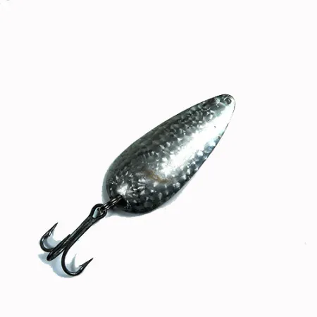 Adorned with a hammered "Crystal" silver scale finish, this classic spoon reflects light across its dimpled surface to catch the eye of deep-water predators. This 3/4 oz (21 g) casting spoon measures 2 3/4 inches (7 cm) and features the iconic oblong, concave profile that Eppinger has refined in Michigan since the company's founding in 1906. Labeled under product code 0334, this Dardevle Dardevlet specimen represents the reliable craftsmanship Lou Eppinger pioneered in his Detroit basement. Looking closely at the hardware, the textured finish and dark treble hook remain in solid 4/5 condition. The heavy-gauge metal construction is intended for a slow, steady retrieve, a testament to a design so effective it was once included in United States military aviation survival kits. The hook is securely mounted to the base of the teardrop-shaped body via a sturdy split ring.
