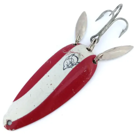 Measuring 2 3/4" (7 cm), the oblong body of this spoon is finished in the legendary high-contrast red and white striped pattern. This 3/4 oz (21 g) casting tool, listed under product code 11062, features the distinctive black devil head logo stamped directly onto the center white stripe. What makes the Eppinger Dardevle Dardevlet Klicker unique is the addition of two teardrop-shaped nickel sonic blades attached to the rear split ring. These blades are designed to click against the spoon and each other during the retrieve, adding a mechanical sound element to the visual flash. The reverse side of the lure showcases a polished nickel finish where the manufacturer’s mark is stamped into the metal. Overall, the specimen is in good shape, showing only light surface scratches and minor paint nicks consistent with a 4/5 condition rating. The hardware remains robust, featuring a standard silver-tone treble hook ready for the water or the display board. Lou Eppinger’s Michigan-born designs have remained largely unchanged for decades, relying on this specific concave geometry to catch the light.