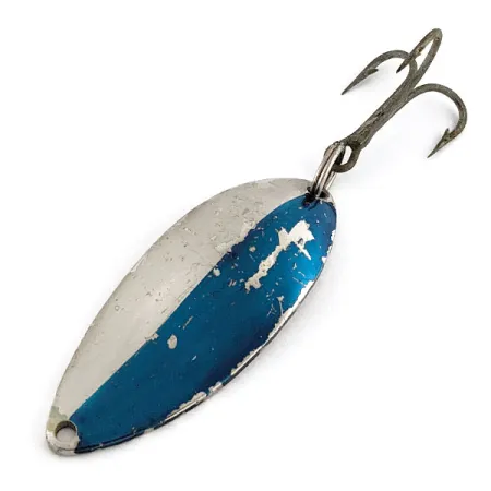 Stamped directly into the metal on the reverse side is the 'DEVLE-DOG 7800' mark, identifying it as a piece of fishing history from Eppinger’s Detroit, U.S.A. era. This 3/4 oz (21 g) spoon features a striking color combination, with one half showing a polished nickel-silver finish and the other a deep metallic blue. Measured at 2 1/2" (6.5 cm), the body displays some honest wear where the blue paint has lifted to reveal the metal beneath, giving the lure a genuine character. Bearing product code 20037, the hardware includes a robust treble hook secured by a split ring, standard for these heavy-duty casting spoons. The condition is a respectable 4/5, reflecting a well-maintained tool from a brand that has been a staple in American tackle boxes since 1906. The heavy gauge of the metal and the specific concave shape achieved by Eppinger’s proprietary dies ensure it stays deep during a steady retrieve.