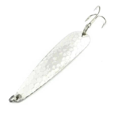 Hammered silver indents create a textured, light-reflecting surface across the body of this trolling specialist. Weighing in at 1/4 oz (8 g), the Flutter-Chuck 3500 is a dedicated Eppinger design that utilizes its concave shape to produce a distinctive wobbling action during retrieval. This 3 1/4" (8 cm) specimen, identified as Product Code 8728, displays the precision of proprietary dies from the Dearborn, Michigan factory. The metal finish is remarkably clean and bright, warranting a condition rating of 5/5. Its hardware features a sharp treble hook attached via a split ring, paired with a similar ring at the head for secure line rigging. For clear water applications, the light-colored spoon and nickel-toned reverse side are built to mimic the natural flash of healthy baitfish.