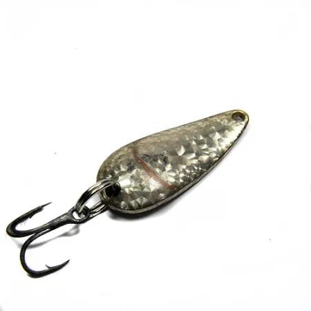 Hammered textures catch the light across the Crystal silver scale finish of this 1 1/4" (3cm) spoon. This Eppinger Lildevle, designated as Product Code 0341, features the classic Detroit U.S.A. stamp on its reverse, a detail that marks its origin from the Michigan-based workshop founded by Lou Eppinger. At a weight of 1/8oz (3.4g), the hardware consists of a robust treble hook connected via a secure split ring. The lure is in 4/5 condition, showing well-preserved plating and clean stampings. The concave body construction is designed for a distinct wobbling movement during a steady retrieve, making it a staple for casting in both clear and stained waters. The textured face is meant to mimic the flash of small forage, a design principle Eppinger has utilized since the early 20th century.