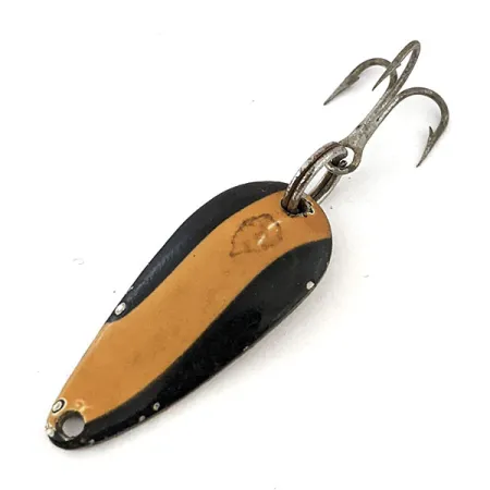Measuring exactly 1 1/4" (3 cm) in length, this vintage Eppinger spoon represents the smaller "Lildevle" model, a size historically prized for light-tackle trout and panfish. The front face is finished in a high-contrast aesthetic, featuring a deep black field split by a prominent tan stripe running down the center. Flipping the lure over reveals a gold-toned metallic back, clearly stamped with "LILDEVLE DETROIT U.S.A.," a detail that anchors this specimen to the company’s early manufacturing period in Michigan. Under product code 13740, this 1/8 oz (3.4 g) lure retains its original split ring hardware and a steel treble hook. The condition is a solid 4/5, showing light chips at the edges and a small circular mark in the paint on the tan stripe. The concave oblong shape of the body is designed to produce a steady wobble when casting or trolling through the water column.